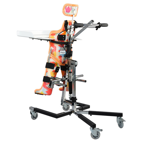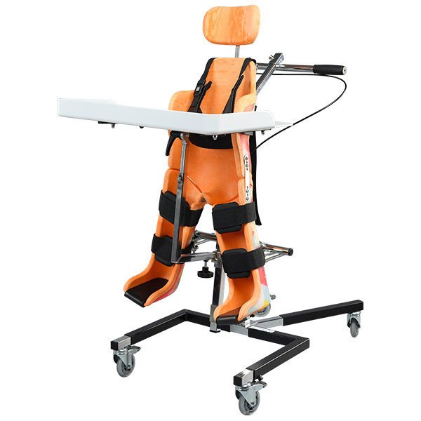 - Associe confort et sécurité dans le cadre d’un traitement thérapeutique et d’éveil. Correction de la position et répartition des appuis par un guidage et un soutien du corps en sation debout.