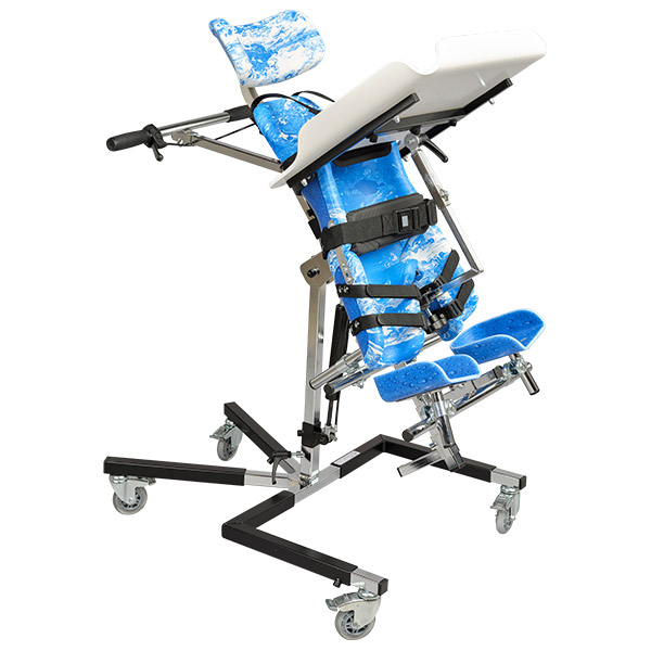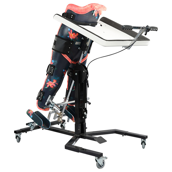 Les segments jambiers et pédieux sont réglables, permettant d’adapter progressivement l’abduction des hanches et la position des pieds. La verticalisation est facilitée par un vérin, offrant un réglage sécurisé de 0° à 90°.