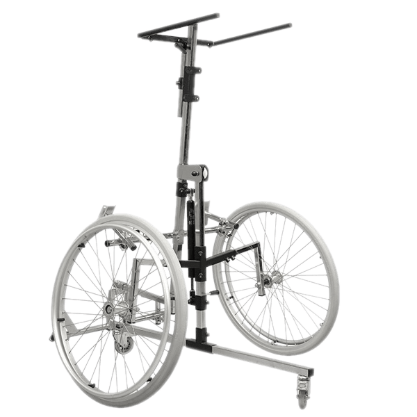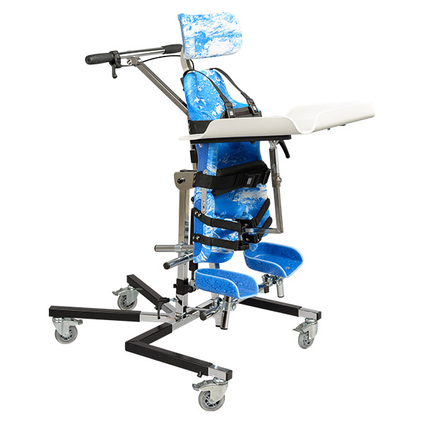 Le châssis de verticalisation a été imaginé par la société Albatros France pour recevoir une coque réalisée sur moulage. La progressivité est assurée par un vérin, permettant ainsi une verticalisation de 0° à 90° en toute sécurité. Le support est évolutif et permet de nombreux réglages pour suivre la croissance et l’évolution de la pathologie.